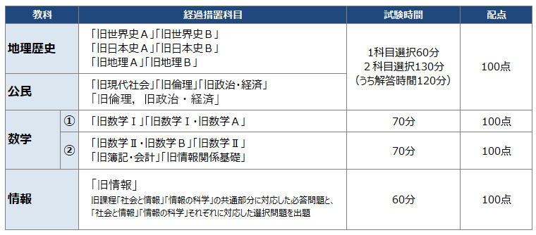 新教育課程の「情報I」に関しては、「旧情報」として別科目が設置され、旧課程「社会と情報」「情報の科学」の共通部分に対応した必答問題と、「社会と情報」「情報の科学」それぞれに対応した選択問題が出題されます。