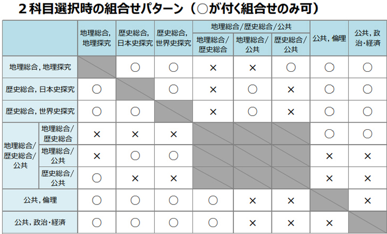 出題科目6科目のうち、最大2科目の選択が可能ですが、『地理総合/歴史総合/公共』を選択する場合は、もう1科目が組合わせ不可となるパターンがあるので注意が必要です(下表参照)。