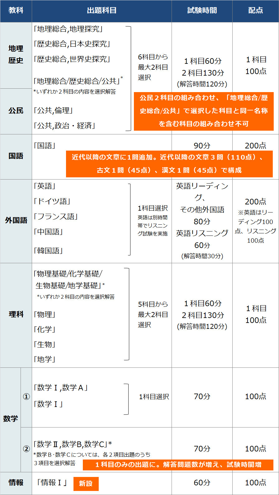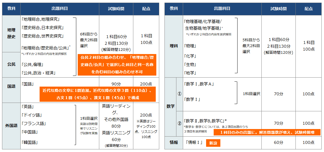 「地理歴史」「公民」では出題科目が大きく再編されるほか、数学②では「数学Ⅱ,数学B,数学C」の1科目となるほか、試験時間が延長されます。国語では試験時間延長のほか、問題構成・配点が変更されます。