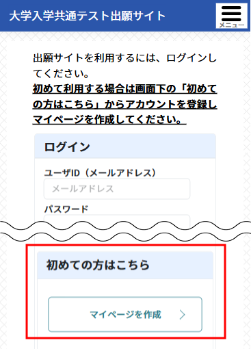 マイページは出願期間前から作成することができます。大学入試センターの共通テスト出願サイトにアクセスします。