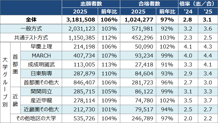 大学グループ別でみていくと、首都圏で倍率の上昇が目立ちます。とくに「成成明國武」や「日東駒専」で合格者の減少幅が大きく、倍率が上昇しています。上位の大学を狙う受験生の併願先として、また少し背伸びをして有名大を狙う受験生の出願先として、このグループの大学が選ばれたようです。近畿圏も2つの大学グループ以外の「その他大」では志願者数は前年並みで、受験生は難関大・有名大志向が強い様子がうかがえます。