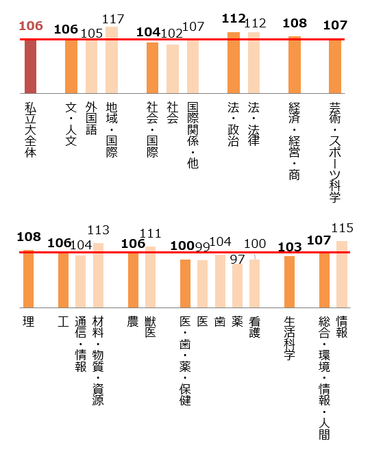 理系学部をみると「理」「工」「農」はいずれも増加しましたが、「工」「農」は私立大全体の前年比106%と近い値にとどまっています。また「医療系」は前年比100%と他系統に比べ低調でした。とくに「薬」は前年比97%と志願者が減少しました。
