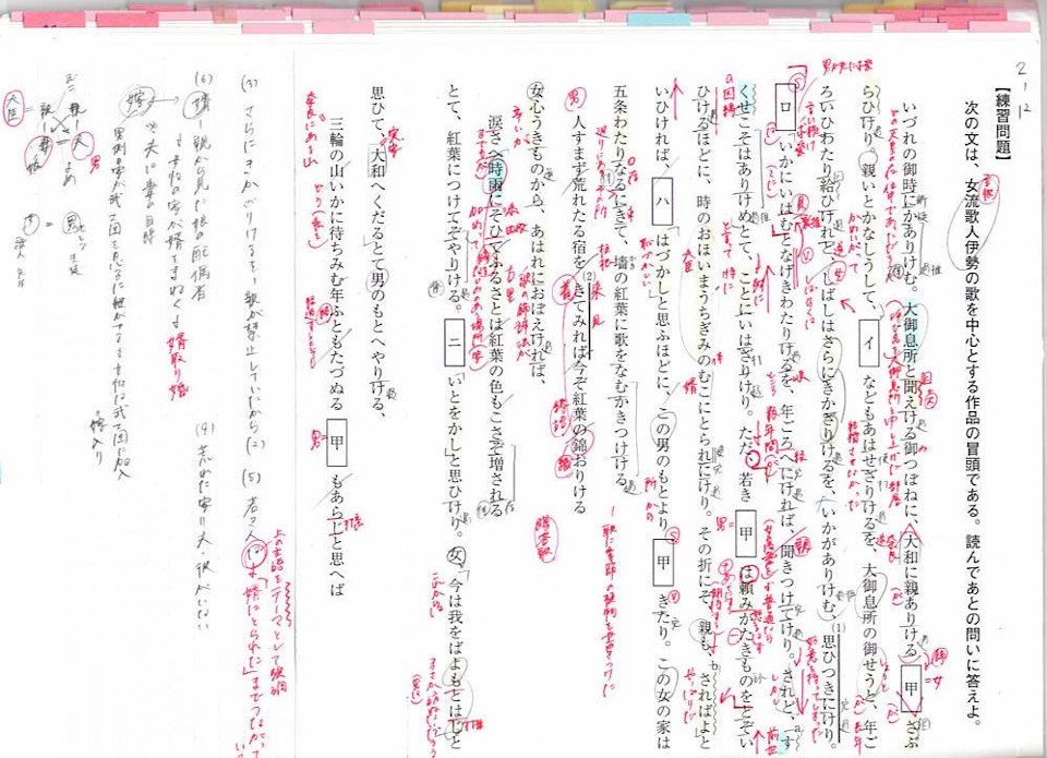 私はノートにテキストの本文のコピーを貼り付けていましたが、そこに書き込みをするペンの色を、予習時と復習時で変えるようにしていました。当然ながら、予習時の本文の解釈や品詞分解は間違えることも多くあります。そこで、色分けすることで書き込みがいつのものであるかが明らかになり、自分がどこでどう間違えたのか、正解は何なのかが一目でわかるようになります。