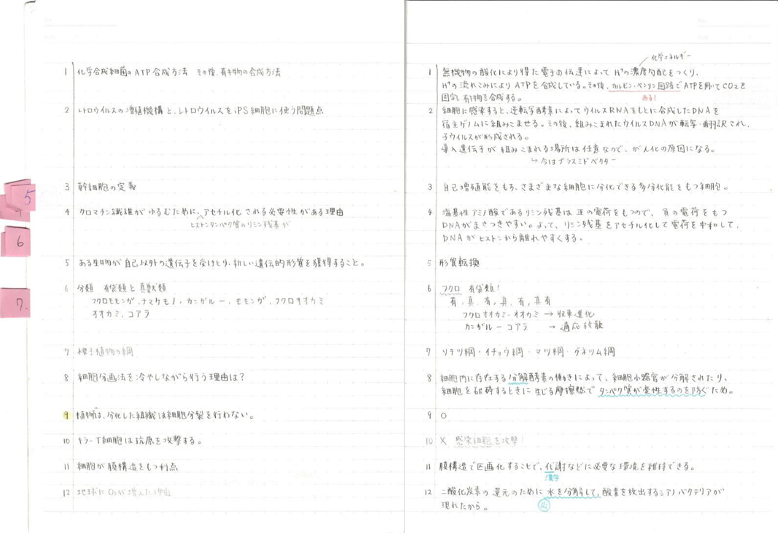 これは生物に限った話ではないですが、できなかった問題をまとめたノートを作っている場合、その問題は逐一すぐに書きましょう。私はノートを持ち歩くのをよく忘れて、問題集に☆のマークだけつけておいてノートに移すのを忘れることが多くありました。どんなに面倒でも、ノートへの反映は忘れないうちにすぐにしましょう。