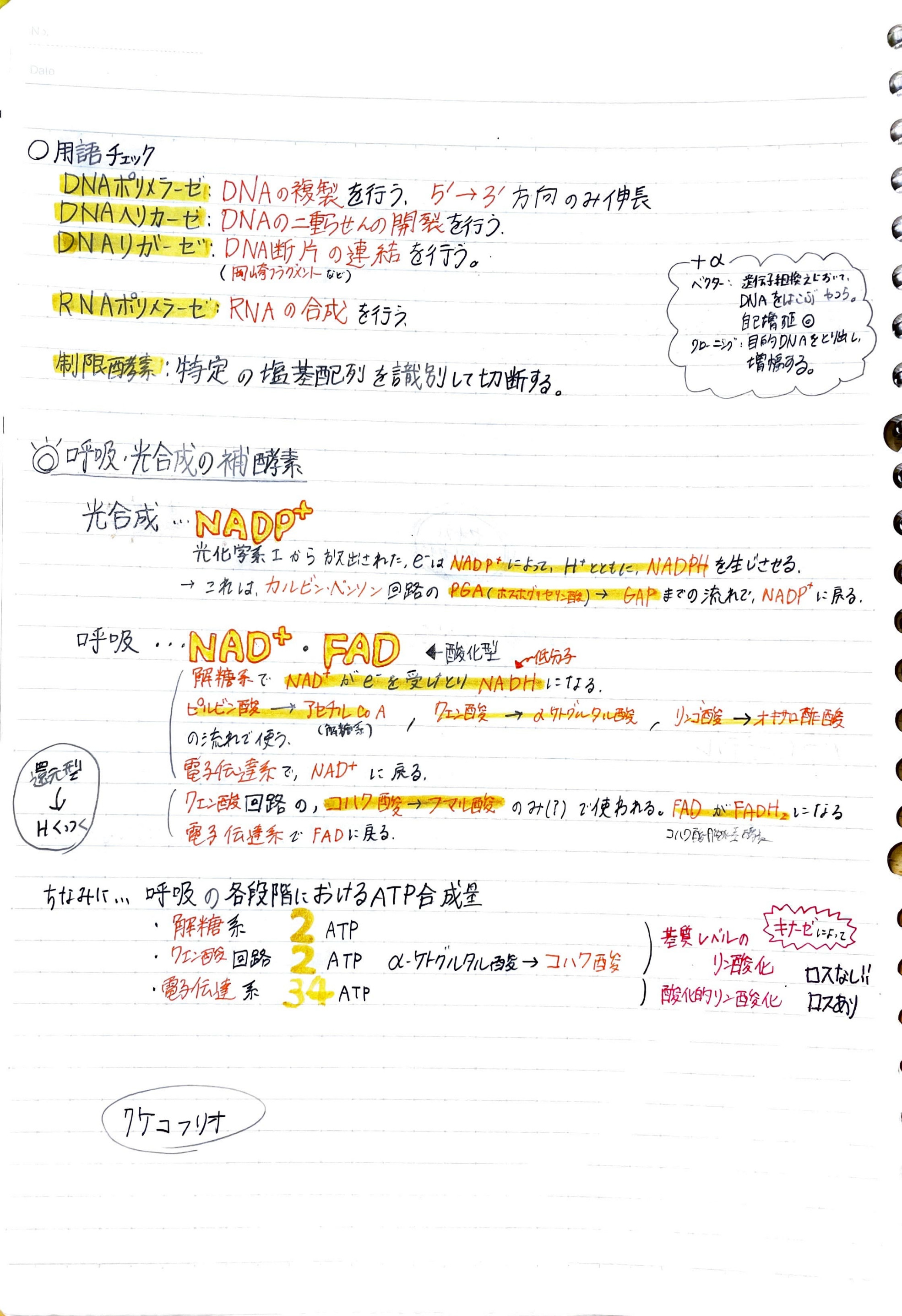 生物の資料集(図説)のなかで、覚えておきたい内容をまとめました。まとめるときに気を付けたことは、3つあります。1つ目は、ただ写すだけではなく、頭の中を整理しながら書くことです。そうすることで大事なことがなにか見えてきます。2つ目は情報を書き込みすぎないことです。後で見返すときに情報が多いと目を通しただけで満足してしまうので、その各項目において覚えたいこと、特に大切なことがわかるように書きました。3つ目は赤シートで隠せるようにすることです。私は電車通学だったので、その時間にちょっと見るということができるように、厳選した覚えたいことをオレンジボールペンで書き、赤シートで消して確認しました。特に大事なことはオレンジボールペンの上から黄色のマーカーを引いて目立たせました。