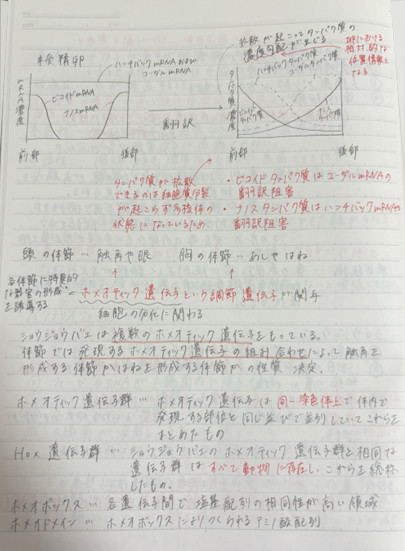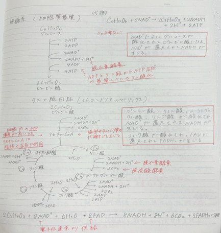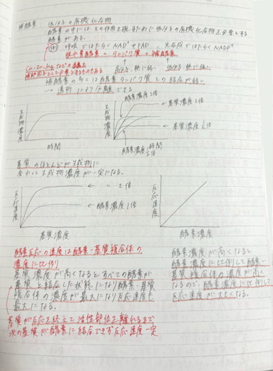 生物はただ暗記すれば良いのではなく、流れが大事です。例えば代謝の分野は図やグラフを書いて全体の流れを把握することで、ただ文字だけでまとめるよりは内容が入ってきやすかったです。特に重要部分は色を変えたり、マーカーで線を引いたりして目立つように書くと後でわかりやすくてよかったです。図を丁寧に書きすぎたり、全ての単元でやろうとすると時間がかかりすぎてしまうので、自分が後で見てわかる程度の適当な図で、苦手分野や自信がない部分だけなど単元を絞って書くといいと思います。また、文字だけより後で見返した時に図があった方がわかりやすいですし、やる気にもなれました。