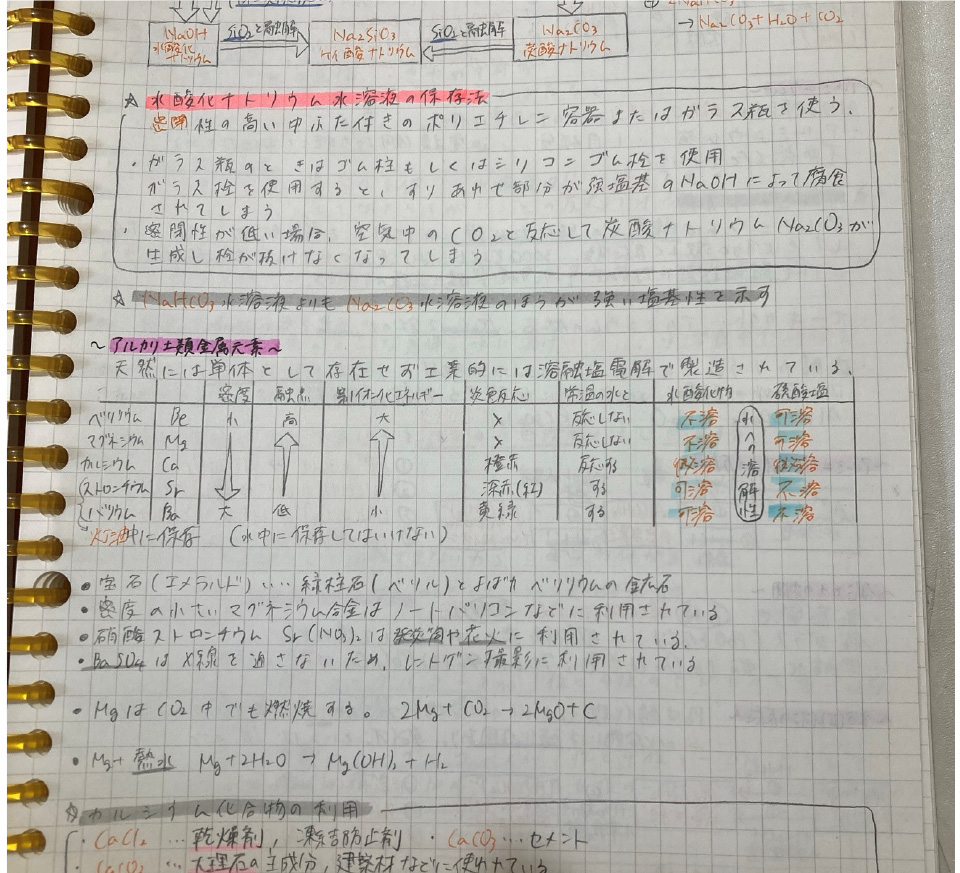 アルカリ元素についてまとめるなら、見出しを黒のボールペンでアルカリ元素と書いてパット見て分かりやすいようにしていました。限られた時間(模試の直前など)で急いで見返すときにどこに何が書いてあるかパット見て分かるようになります。