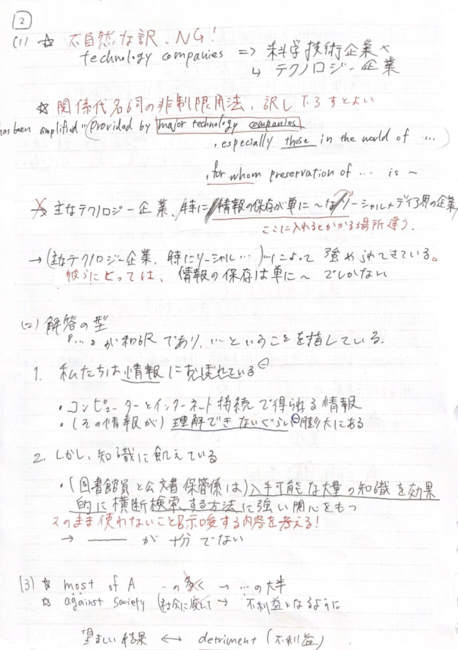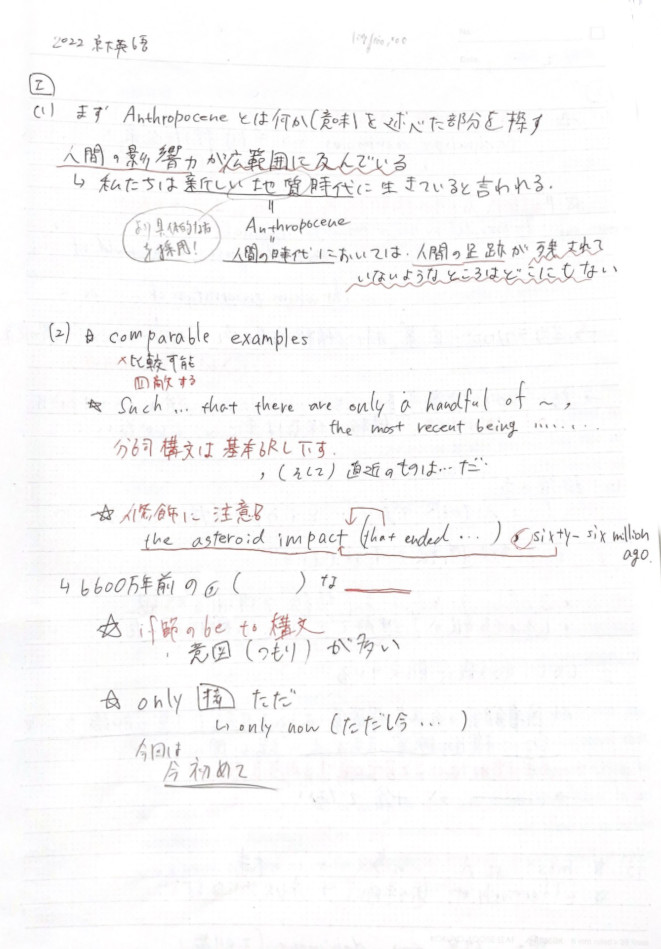 私は、得点源とすべきなのは英文和訳だと思っていました。そのため、構文解釈の力を伸ばすことを意識して、復習ノートも作っていました。具体的にどうしていたかというと、たとえば、修飾をかけるところを間違ったら、「修飾に注意」というように赤字で書き、下に該当箇所の文を抜き出して修飾関係を見える化していました。また、単語の訳し方を間違ったときは、自分の解答もノートに書き留めて置くようにしました。Comparable examples→「×比較可能な例」「○匹敵する例」というような感じです。どう考えてその訳をあてるのかまで書くと、定着しやすいかも知れません(先の例でいうと、「比較する対象があるから、~に匹敵すると訳した方が適切」という風に書くとよいと思います)。