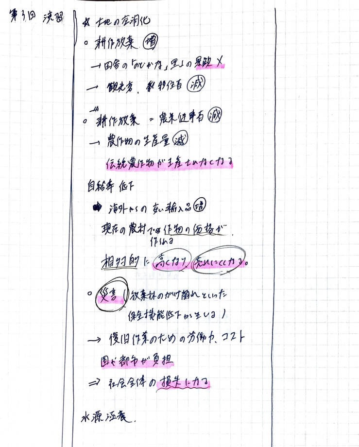 - 様々なことを書きましたが、私も試行錯誤しながらノートを作りました。まとめ方は様々で、ノートに書かなくてもすごい人はいるし、ノートをこだわって書いている人もいます。自分に何が足りていないのかを考え、ノートを書く目的を考えて、書くと良いと思います。私は、興味深い、自分もこれ書きたいと思ったものを忘れてしまうことが多々あったので、ぱっと見て内容が思い出せるようなノートを作りました。これは一例に過ぎず、周りにも良いノートを作っている子はいると思います。良いなと思ったことはまねをし、自分なりのノートを作ってください。そして困った時は先生に相談してください。もう一回授業内容を書いてみようとしても書いてみると書けないことが多々あります。そこを先生に聞きに行くと、それ以上の回答をしてくださる先生方が多いのでさらに学習を深めることができると思います。