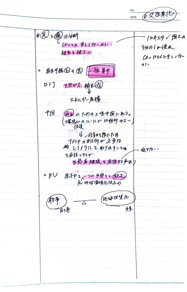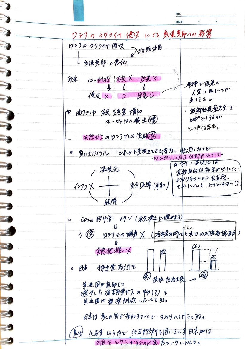 これまで知らなかった、そういう考え方をしたことがなかったというものに出会ったら、自分の思考を深めるチャンス!ぜひノートに書いておくことをおすすめします。私も戦争と気候変動が関係しているということを知って下記のようにまとめました。視点を増やすために良いと思います。ちなみにこれはPOINT2で書いたテレビから得た視点です。
