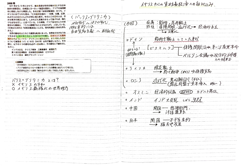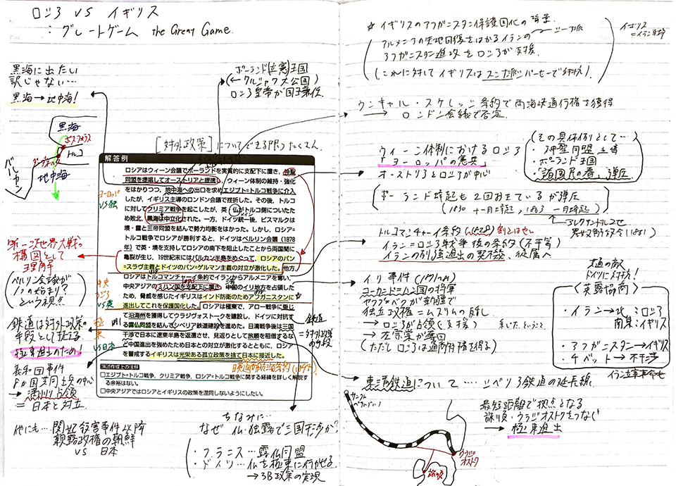 何度も論述問題を解いていくと、よく出るフレーズや自分がよく間違えるフレーズがわかってきます。そういった部分も赤本の解答例のコピーから矢印を引いて書き込みました。また、解答例も完璧ではありません。他の解答例などと比べた上で「最高の解答」を作り出すために、解答例を添削していくようなイメージでノートを作りました。これによって、採点者の視点で解答例を眺める習慣が付き、論述力向上につながりました。