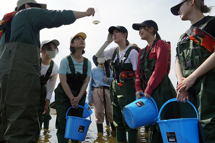持続可能な社会の実現に貢献するため、環境分野を多角的に理解し、広い視野を持つスペシャリストを育成します。環境や生態系への負荷軽減や防災、環境政策などについて取り組む「保全・まちづくり分野」と、バイオテクノロジーやエネルギー資源、化学物質の利用などに取り組む「生命・資源応用分野」、2つの領域から自由に科目が選択でき、実践的な学びからめざす進路を明確にしていくカリキュラム設計が可能です。専門教育科目は、生命科学や自然・社会の共生システムに関する充実した内容で、実践力と研究力の両方を身につけます。1年次から近隣の里山や里海、環境保全施設などを巡る多彩なフィールドワークを実施。そのなかで学生自身が発見した課題を「社会連携プロジェクト」につなげ、専用のプロジェクト棟を活用して社会と連携しながら解決をめざします。