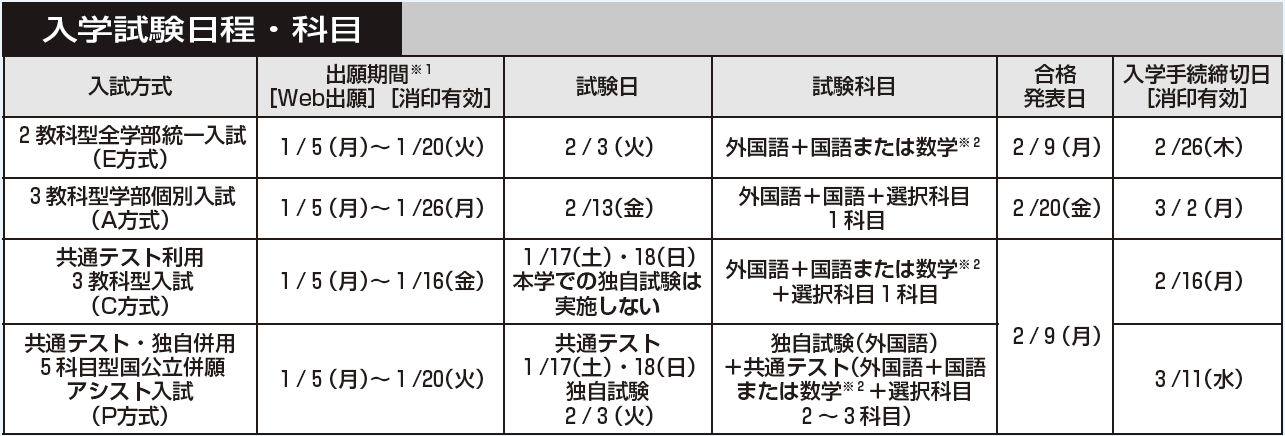※1 必要書類は郵送で消印有効 ※2 国際日本学専攻は国語、環境サステナビリティ学専攻は数学の選択が必須
