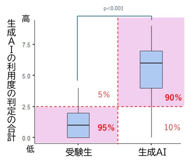 まず、自由度の高い(B5用紙1枚程度のスペースに自由に記述できる)タイプの自筆の事前提出課題について、生成AIの利活用の申告がない受験生の答案と生成AIが作成したものを書き起こしたフェイクの答案とをどちらかわからない状態にして用意し、複数名でルーブリック評価した。その結果、実際に受験生が作成したものの方が、有意に点数が高くなる傾向がみられた(図1)。また評価者も93%の精度で生成AIの利用の有無を評価でき、生成AIを使用していないのに生成AIを利用していると判定されたものは5%であった(図2)。