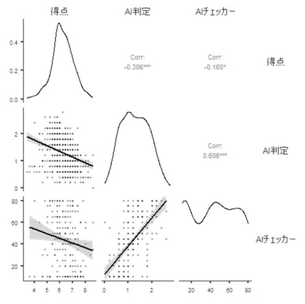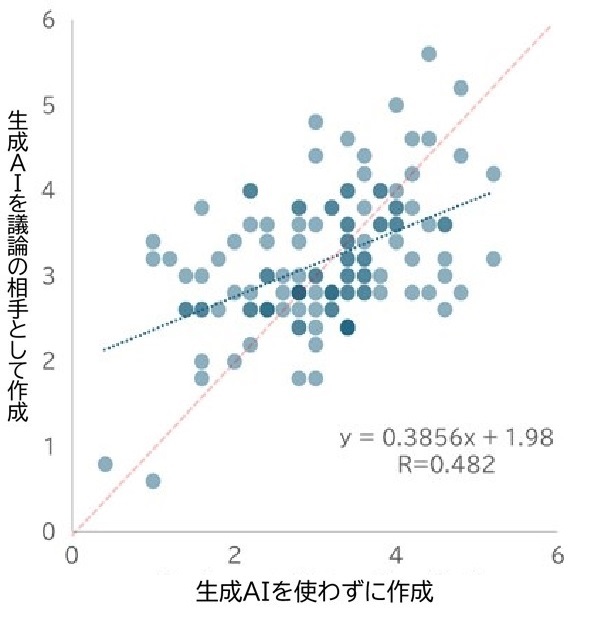 一方、短い文章に関しての研究では異なった結果が得られた。大学生に「生成AIを使わずに作成」「生成AIのみで作成」「生成AIと協働して作成」という方法で、400字程度の志望理由書を作成してもらいWEBフォームに入力してもらった。これを先と同様に複数名でルーブリック評価したところ、3種類の平均点には有意な差は見られなかった。一方で作成者をベースに見てみると、生成AIを利用しないで作成したものと生成AIのみで作成したものには相関がみられなかったが、生成AIを議論の相手として作成したものには正の相関がみられた(図3)。このことから、ルーブリックを工夫することで作成者の能力を測れる可能性があると考えている。