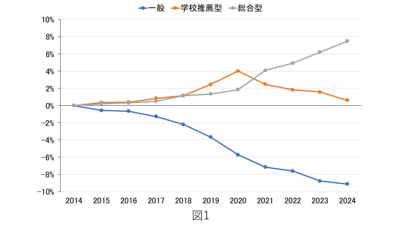 この変化をより明確に捉えるために、2014年度の各選抜区分の入学者割合を基準にして、各年度との差分を示したものが図1である。一般選抜入学者の割合が減少する一方で、対照的に総合型選抜入学者の割合が増加している。両者と比べると学校推薦型入学者の割合の変動は小さい。また、政策的な流れを重ね合わせると、高大接続改革に基づく新制度による入試が始まった2021年度以降、総合型選抜入学者の割合の増加が一層際立っている。なお、図1は全体の変化を示したものであるが、設置者別に見ると、この傾向は私立大学で特に顕著であった。国公立大学でも一般選抜入学者の割合は減少し、総合型選抜入学者の割合が増加しているが、その変化の幅は私立大学ほど大きくない。