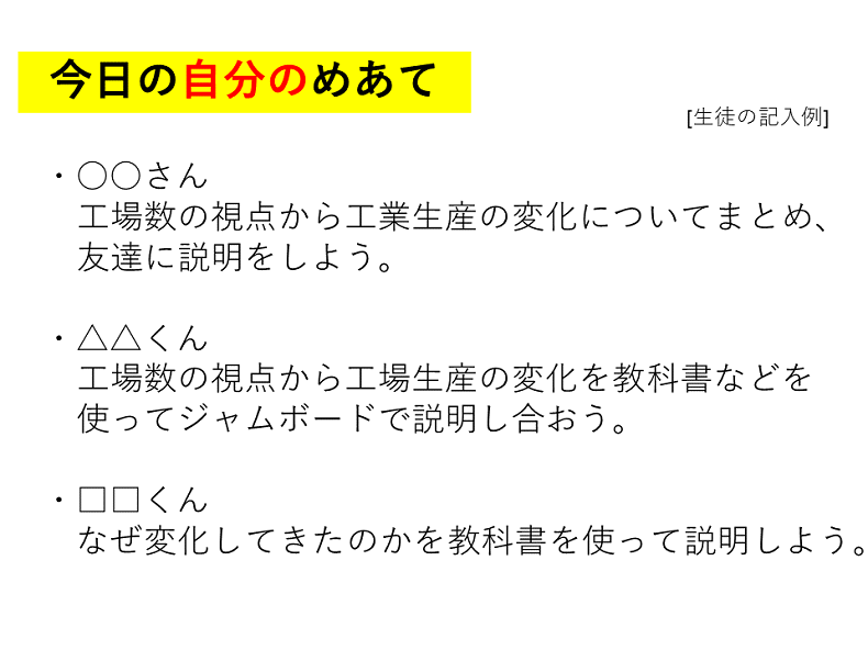 こちらは、ある学校の社会科の5年生の授業で、授業のはじめに子どもが学習課題を意識するときのものです。工場がどのように変化したか、という学習課題は教科書にも書いてあって、この工場の数の変化や生産の変化を考えますが、それを自分がどのように学ぶかを、各人で決めています。