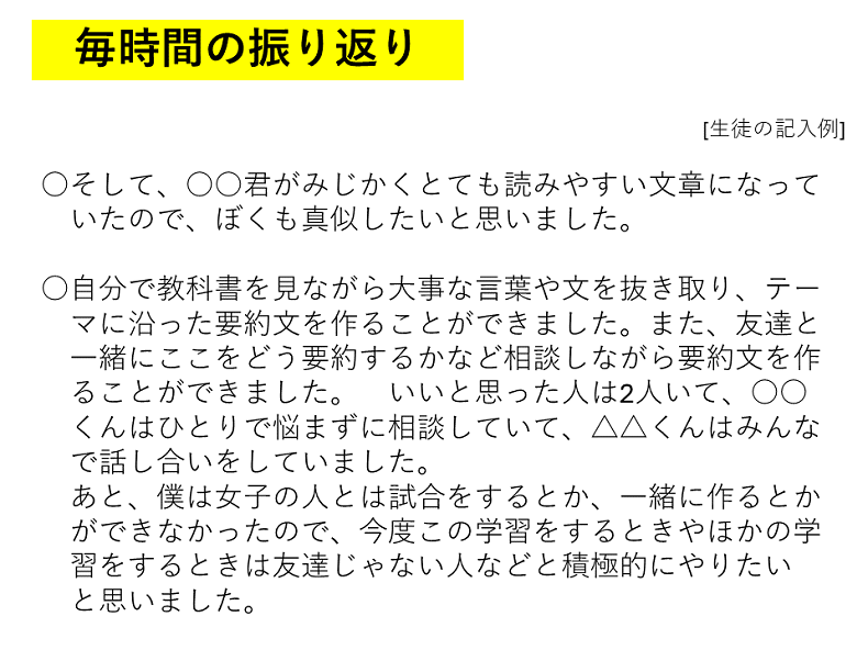 これは、学年や教科によっても、子どもたちの学習経験によっても違います。最初は先生が強めに指導して、子どもに任せられるようになったら、子どもが振り返るための助言を工夫します。例えば、最初は「振り返り」と言っても何をするのかわからないので、「振り返りというのは、こういうことを書くことだよ。○○くんが書いたのがとてもいい振り返りなんだよ」といったことを、積極的に指導することが必要です。さらに、その振り返る内容は、学び手としての向上につながるものでなければいけません。