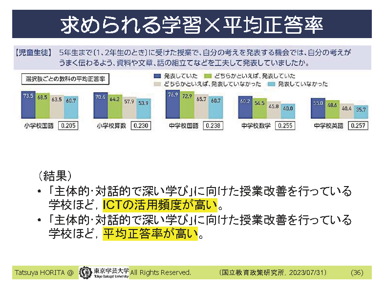 この2つの話をまとめると、「主体的・対話的で深い学び」を実施している所ほどICTの活用頻度が高く、平均正答率が高いということになりますが、ICTがダイレクトに学力を上げているという話ではありません。