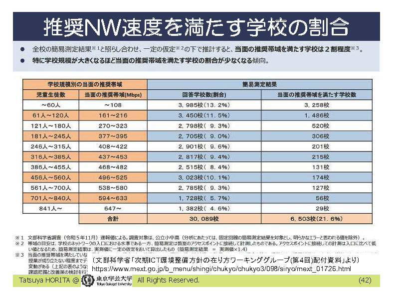 回答を見ると、当面の推奨帯域を満たしている所は21.6%に過ぎません。「当面の」というのは、文科省が「とりあえず、最低限今はこれでやっておいてね」というレベルですが、それでも今のところ2割程度の学校しか達成できてないのです。