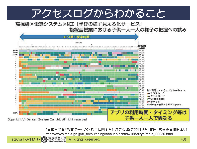 東京学芸大学の高橋純先生は、児童生徒の端末の利用状況の解析から、「学びの様子の見える化」の研究をされています。このグラフは、縦軸が生徒で、横軸が45分の授業のどのタイミングで何にアクセスしているかを表したものです。どこに・いつアクセスするかというのは、任意のタイミングなので、子どもによってこれだけ違います。