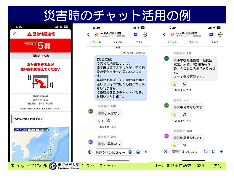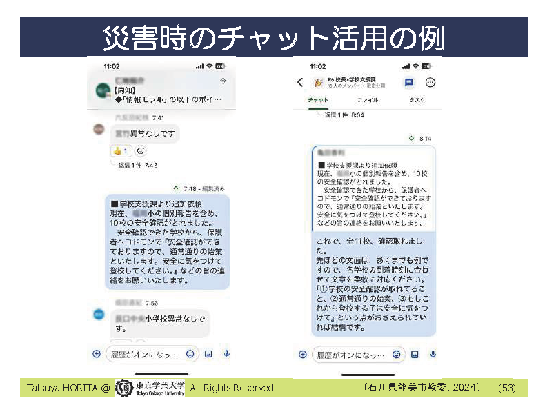 これは、判断は現場でしつつ、状況の把握は常に透明化されているという、教育委員会と学校の連携の例です。こういったことが非常に大事なのです。6時53分は勤務時間じゃないだろう、と言う人がいますが、子どもの安全の方が重要でしょう。この市は、お正月に子どもたちが端末を持ち帰っていたので、子ども同士たちがみんなでメッセージ交換していました。そのため、安否確認も非常にやりやすかったそうです。
