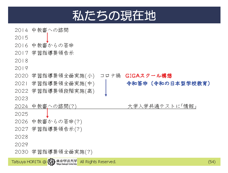 私たちの現在地を年表にしました。おそらく、今年2024年の秋に、文部科学大臣から中教審に「次の学習指導要領をどうしていくか、検討してください」という諮問が出るでしょう。