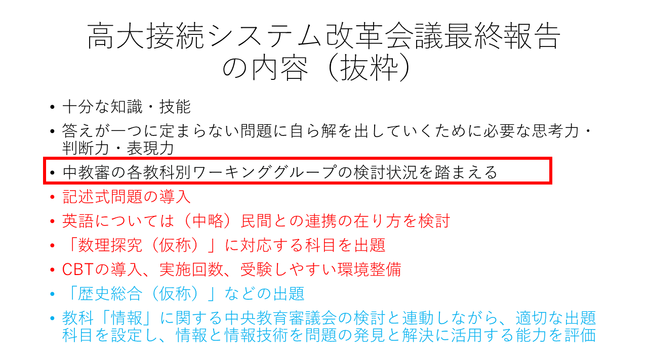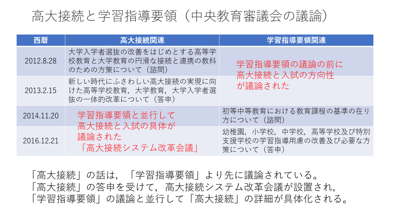 そして学習指導要領の作成にあたっては、中教審の教科別ワーキンググループの検討状況を踏まえると同時に、高大接続システム改革会議の検討とも連動していきました。高大接続システム改革会議の最終報告にも、「中教審の各教科ワーキンググループの検討状況を踏まえる」とあります。