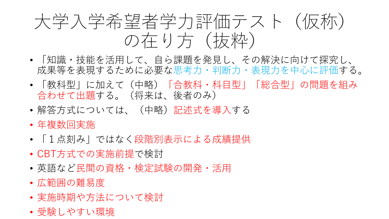 そのとき出た「大学入学希望者学力評価テスト(仮称)」案では、「合教科・科目型、総合型」「年複数回実施」「1点刻みでなく段階別評価」「CBT」「民間の資格・検定試験の開発・活用」「広範囲の難易度」「実施の時期や方法」「受験しやすい環境」など、すばらしいコンセプトが示されました。