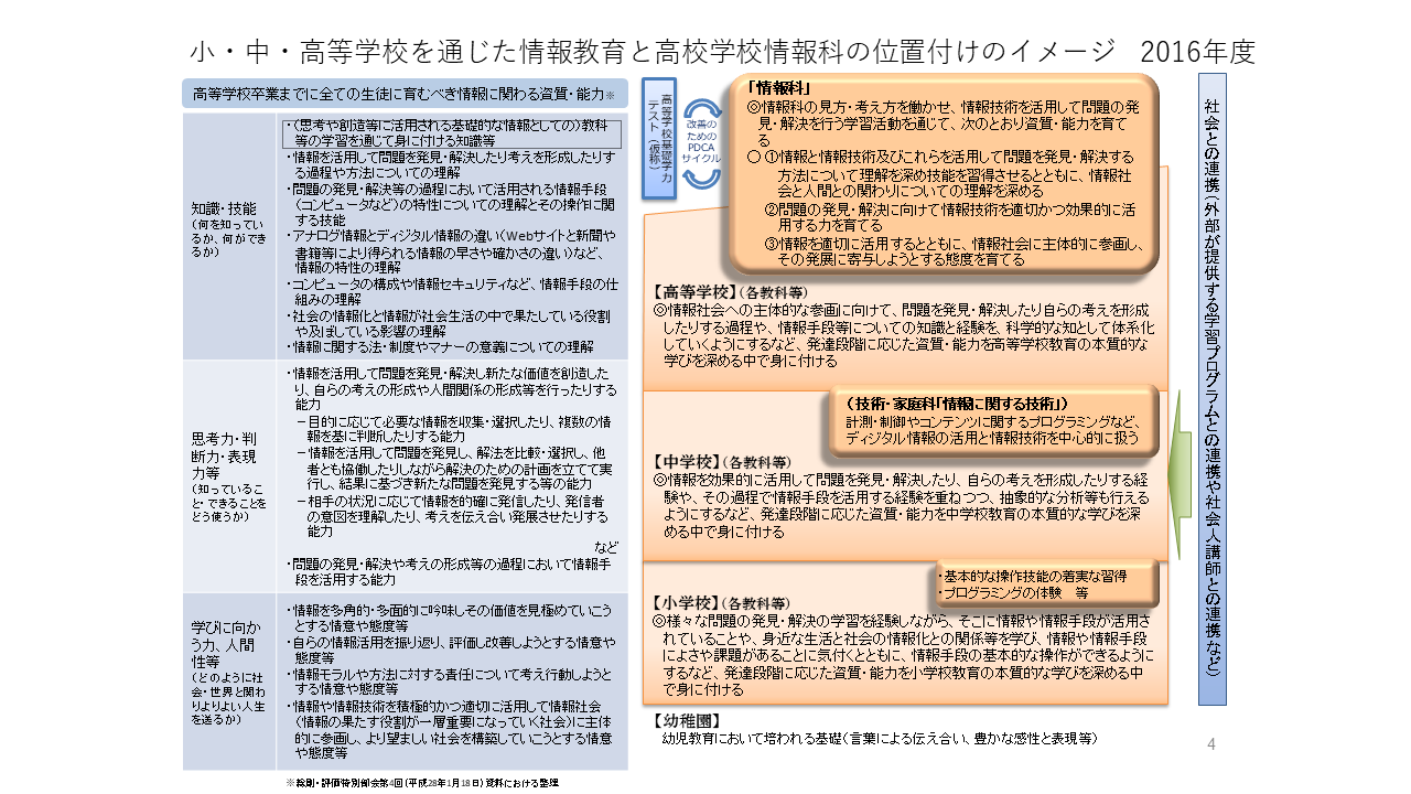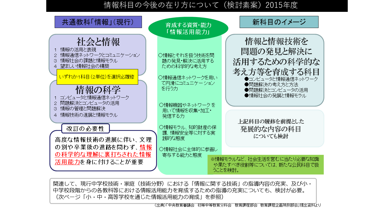 最初に出た新教科「情報」のイメージでは、まず現行の2科目を1つの科目にすることと、教科の内容を情報活用能力の3つの柱である「情報活用の実践力」「情報の科学的な理解」「情報社会に参画する態度」のうち、「情報の科学的理解」にある程度振ったものとして、情報活用能力の要となる科目とすることを示しました。