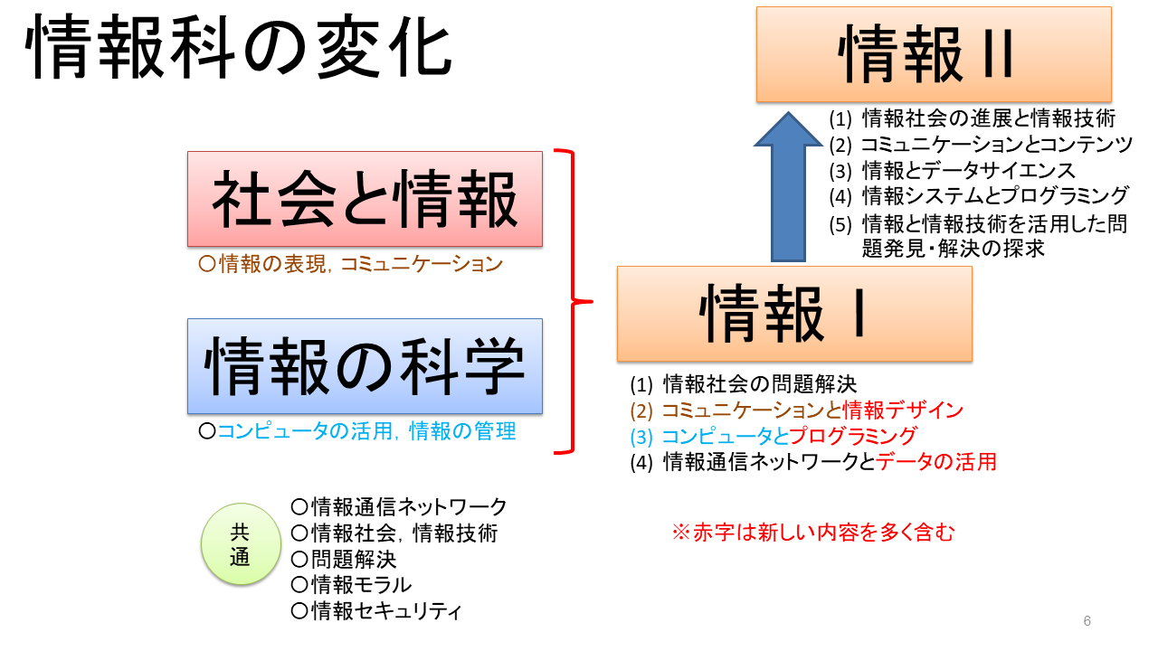 現行学習指導要領に向けた改訂の際、文部科学省の中では、これからの日本を考えたとき情報科の科目は1つでよいのではないか、という考えがあり、現在の「情報Ⅰ」になったわけです。