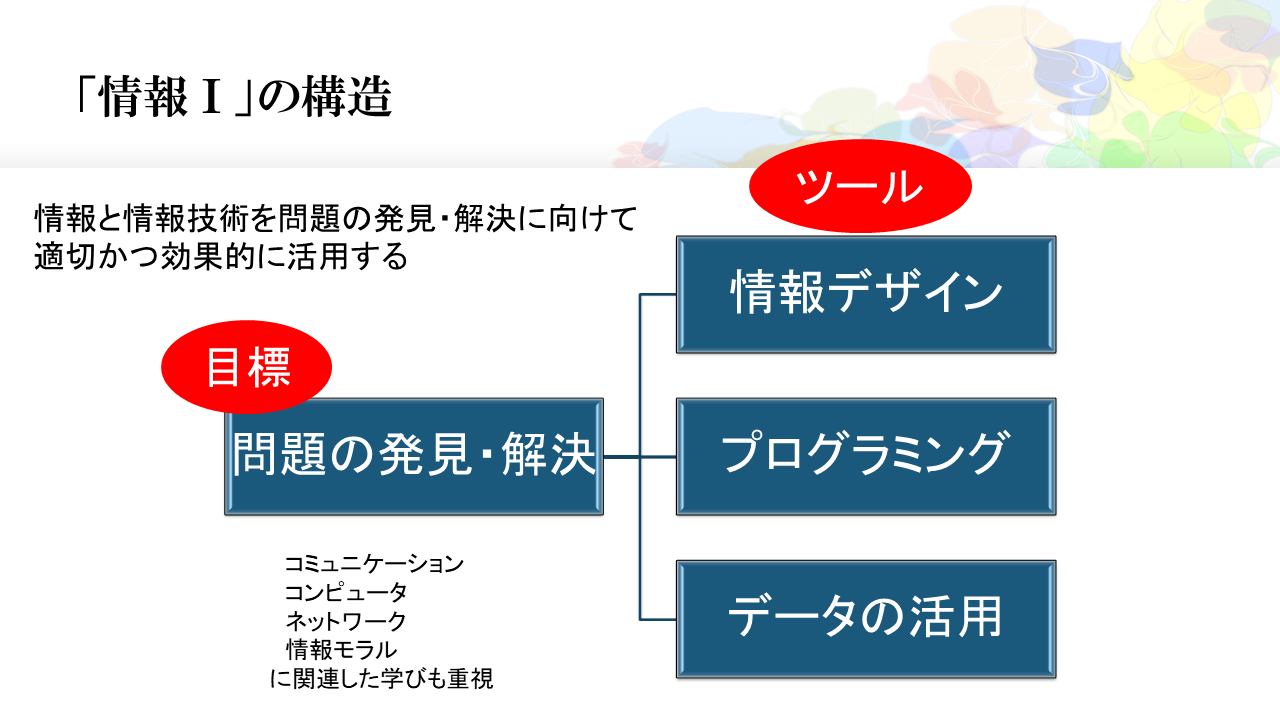 「情報Ⅰ」の構造として、科目の目標は「問題の発見・解決」であり、「情報デザイン」「プログラミング」「データの活用」はそのためのツールです。