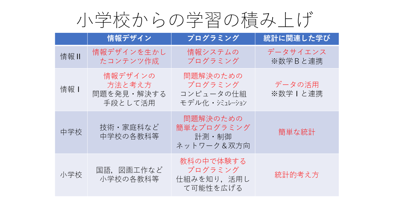 最終的に決まった「情報Ⅰ」は2単位ですが、その内容は小中高を通して培ったものが含まれています。