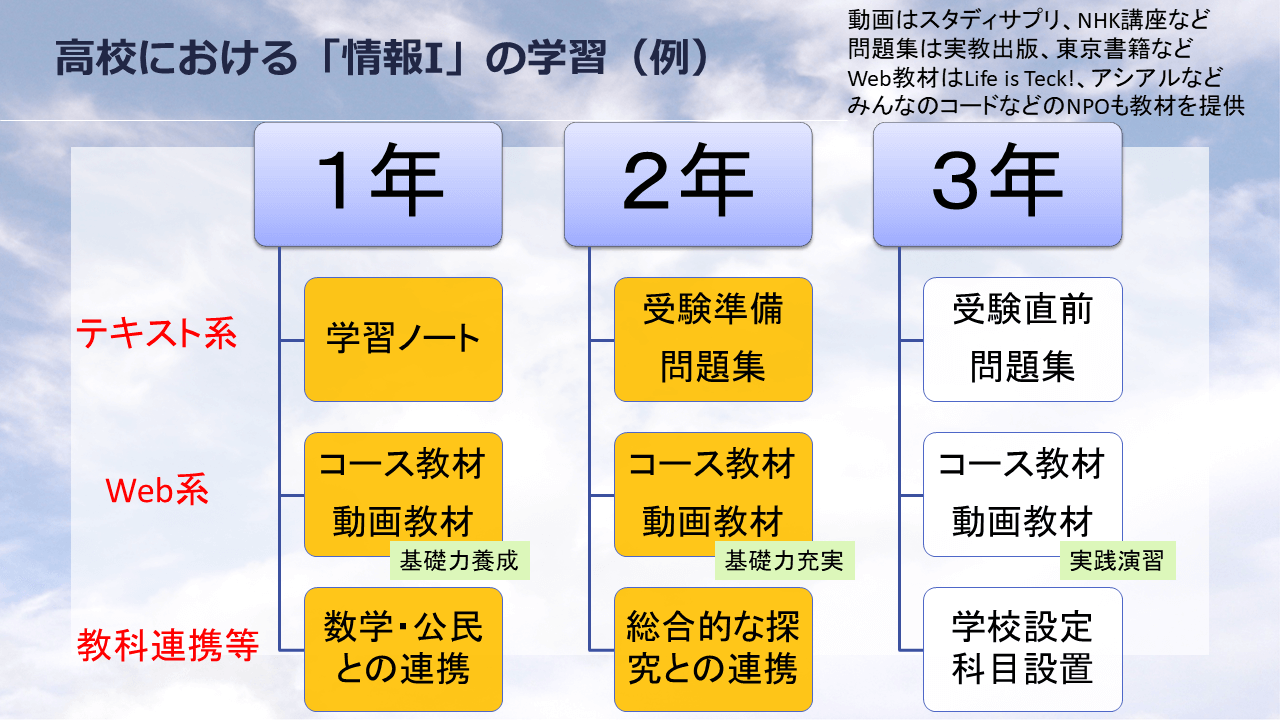 現在市販の問題集や教材をどのように使っていくかについては、「情報Ⅰ」の授業のある1年生(学校によっては2年生)で教科書と傍用の学習ノートで基礎固めをして、2年生は「情報」の授業はないけれど、易しめの問題集で自習させるというところが多いです。そして3年生は受験用の少し難しめの問題集に取り組ませることになります。