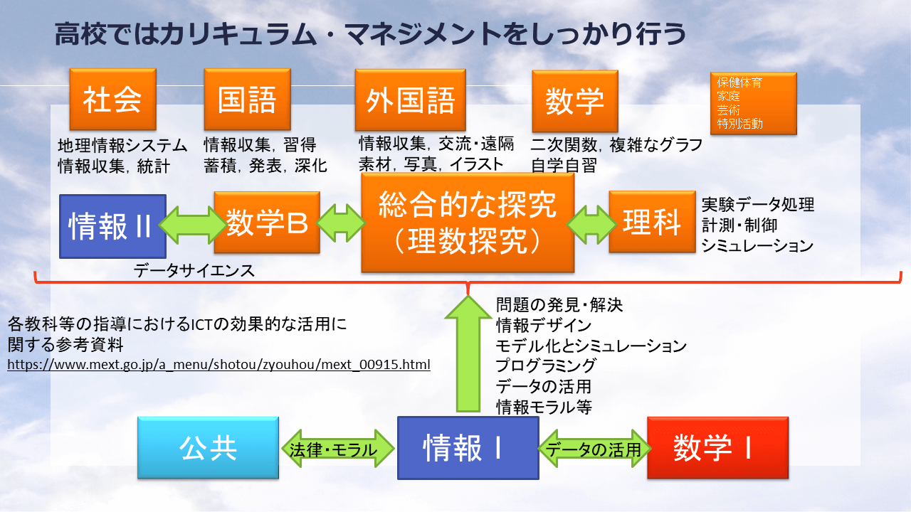 そのためには、学校全体で教科連携をして、総合的な探究の時間などで深めていく。同時に各教科でも「情報Ⅰ」の学びをしっかり活かしていく、というカリキュラム・マネジメントが大切です。その部分の調整をしっかりやっていただきたいと思います。
