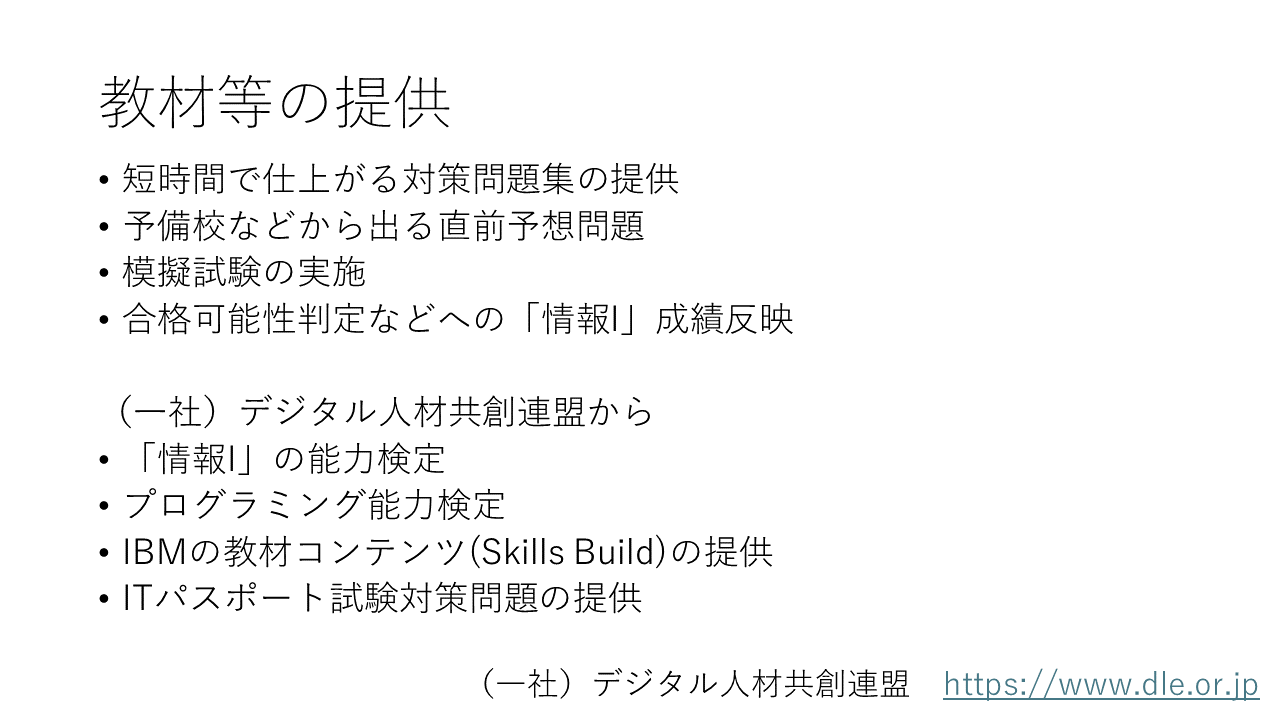 デジタル人材共創連盟では、「情報Ⅰ」やプログラミングの能力検定(※1)を行っています。初めにお話ししたように、この秋からは日本IBMと協力して、Pythonのプログラミングを高校生が身に付けるためのコンテンツを出していきます。これは、完全無料でどの学校でも使えるように提供する予定です。GMOメディアと協力してITパスポート試験対策問題(※2)もすでに出していますが、これも無料でご利用いただけます。