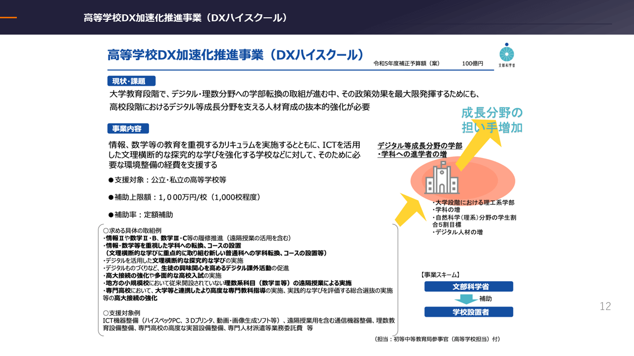 文部科学省の高等学校DX加速化推進事業(DXハイスクール)は、昨年度1校1000万円を1000校、総額100億円の補正予算を組んで公募し、この4月から実施されています。この公募要件には「情報Ⅱ」の実施が含まれていたので、今後「情報Ⅱ」を実施する高校が増えることになります。