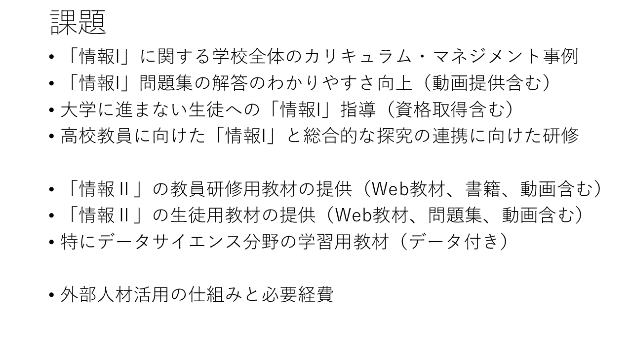 こういったことを踏まえて、高校教員に向けて「情報」と総合的な探究の時間との連携に向けた研修や、「情報Ⅱ」の教員研修用教材(Web教材、書籍、動画など)も必要です。